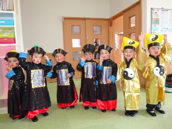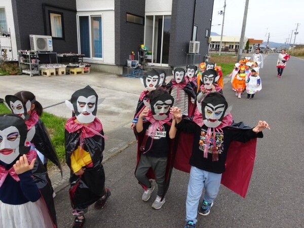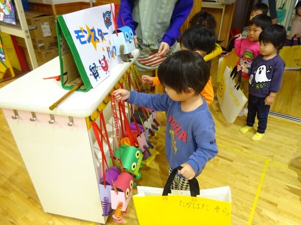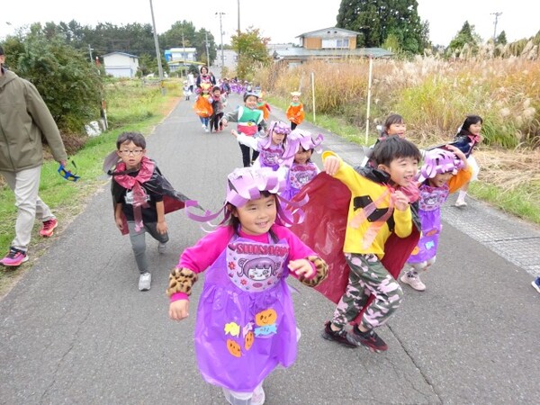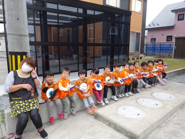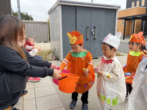 | ハロウィンでは、子どもたちが仮装を楽しみ、園外に出掛け「お菓子をくれなきゃ〜」と歌と踊りでご近所の方からお菓子をいただきました。笑顔とかわいい姿で楽しい時間を過ごしました。 |