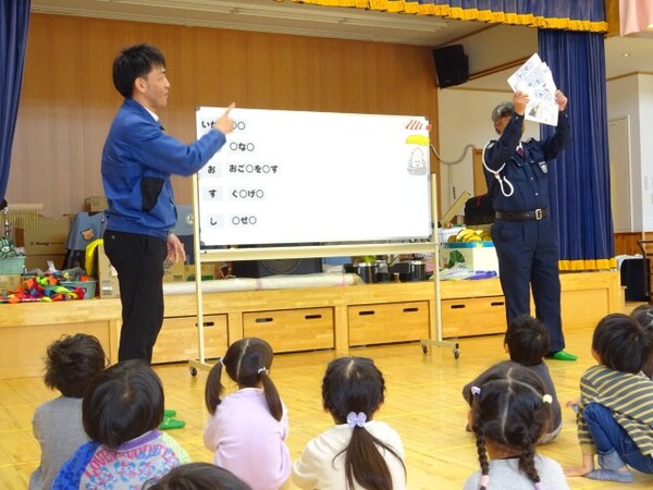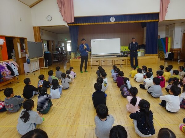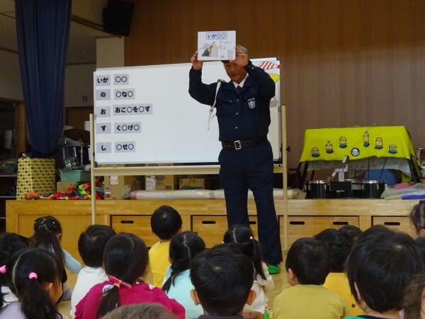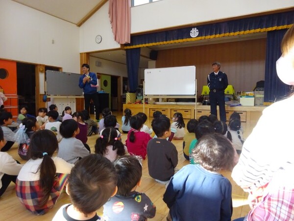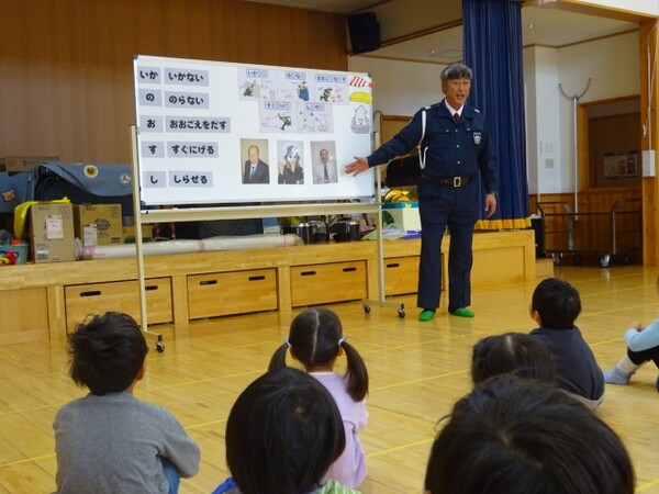 | 不審者侵入を想定した避難訓練を行い、子どもたちは合言葉「アメ食べるよ」を聞いて保育者の指示に従い落ち着いて行動することができました。安全を守る大切な訓練となりました。 |
